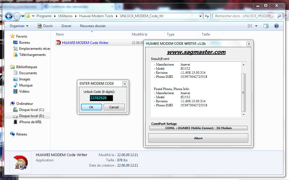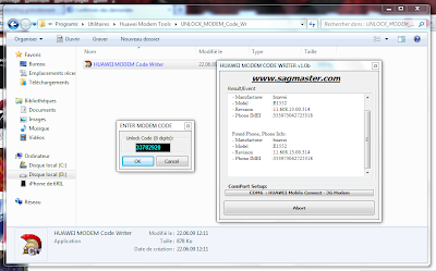 Lorsque votre modem aura bien été détecté, cliquez sur Unlock Modem et dans la fenetre qui s'affiche entrez le code UNLOCK que vous avez noté sur papier plus haut.