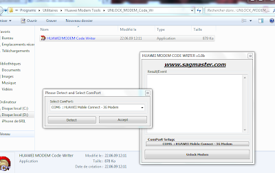 4. Téléchargez HUAWEI MODEM CODE WRITER à partir de ce lien http://www.mediafire.com/download/agcecavwcs8iar2/Unlock+code+by+IMEI.rar ouvrez le puis cliquez sur: Please select COM Port dans la petite fenêtre qui apparait cliquez sur: Detect